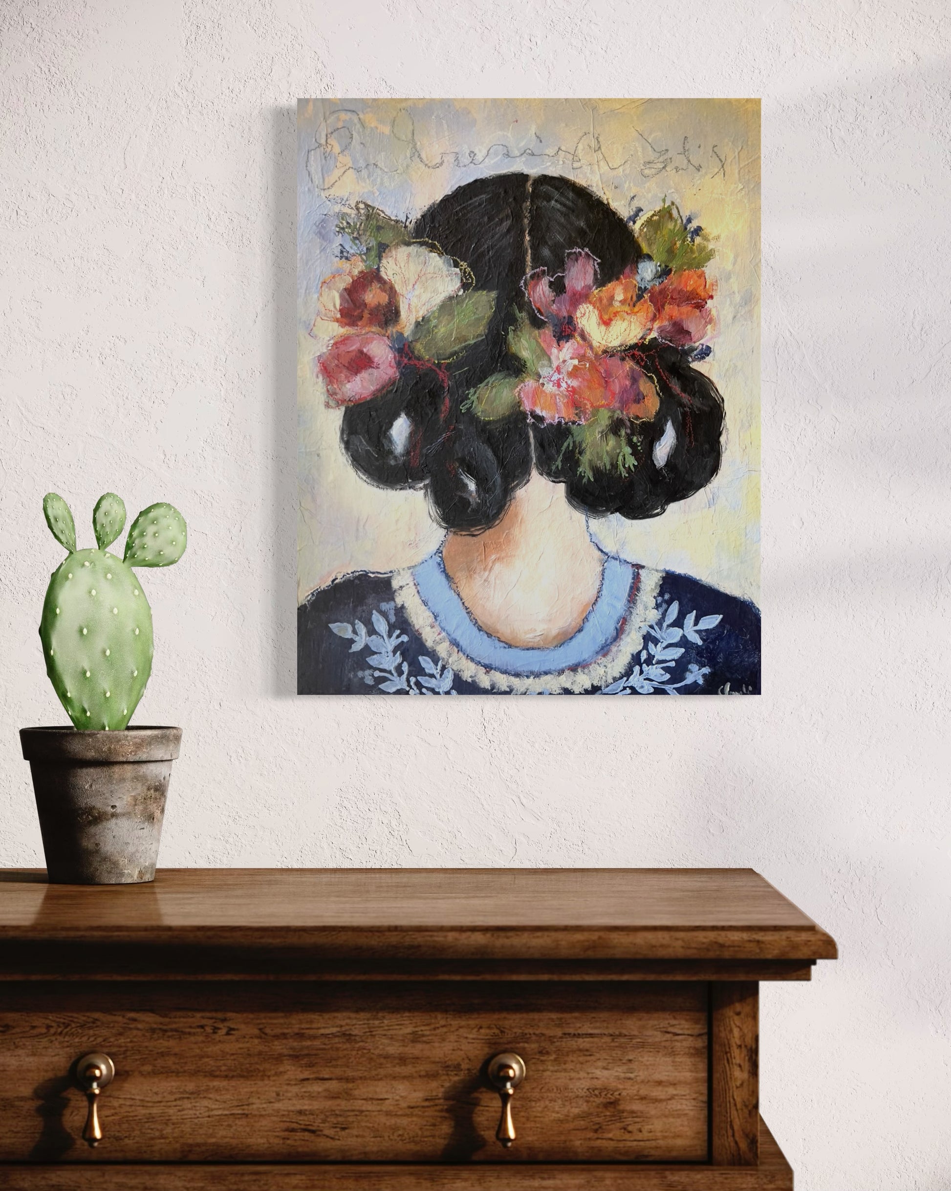 The canvas size is 14x18“, painted with oils and acrylics on canvas with Japanese paper.